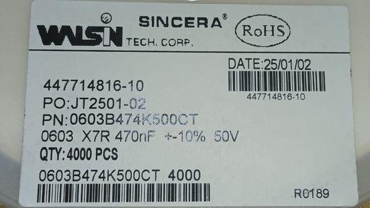 470nF 50V 0603 SMD Ceramic Capacitor 474 10% walsin X7R ETD11372